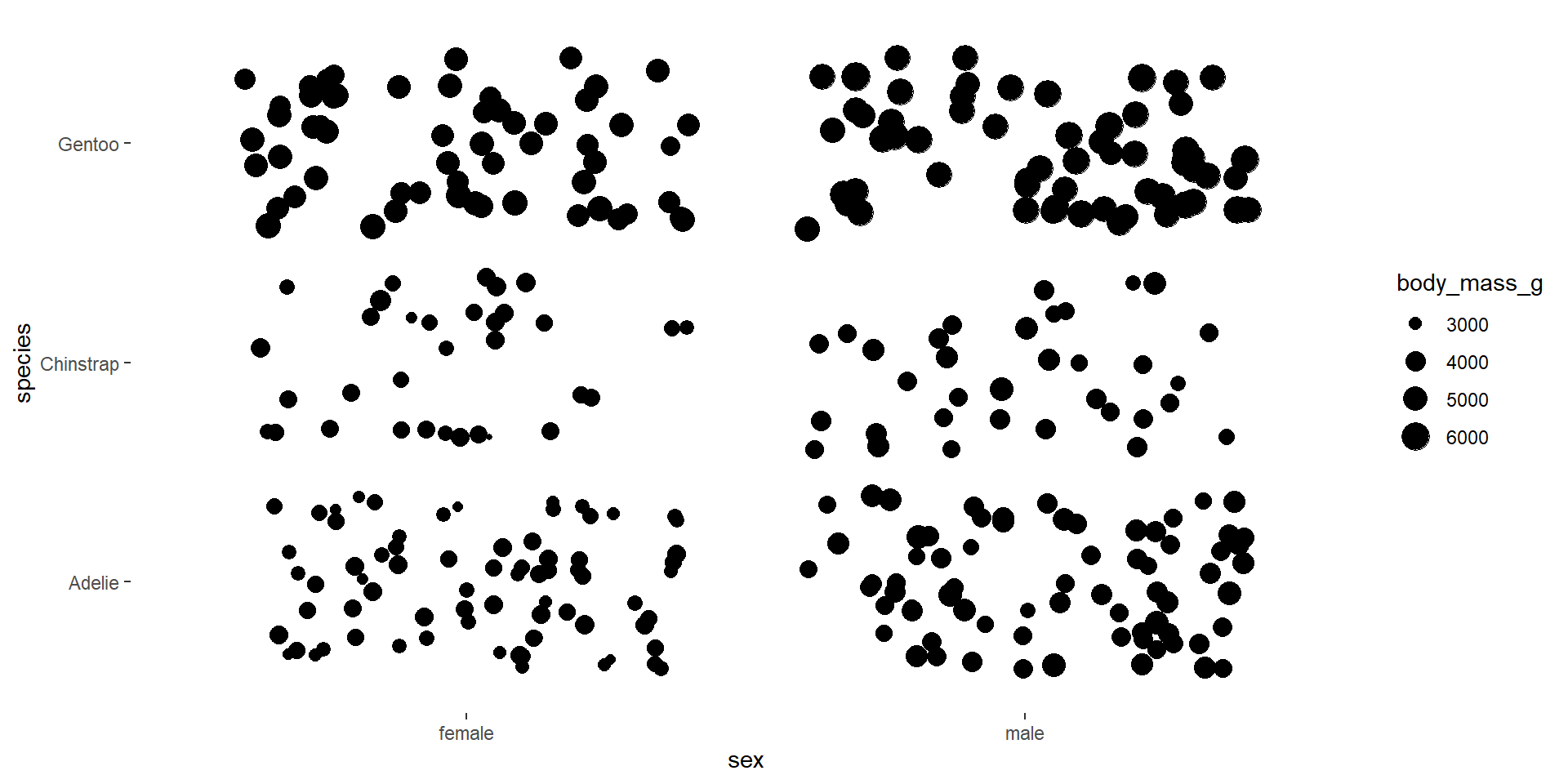 x and y for positioncolor and fill for color scalealpha for opacitysize for sizeSize is much worse than position for showing continuous data!